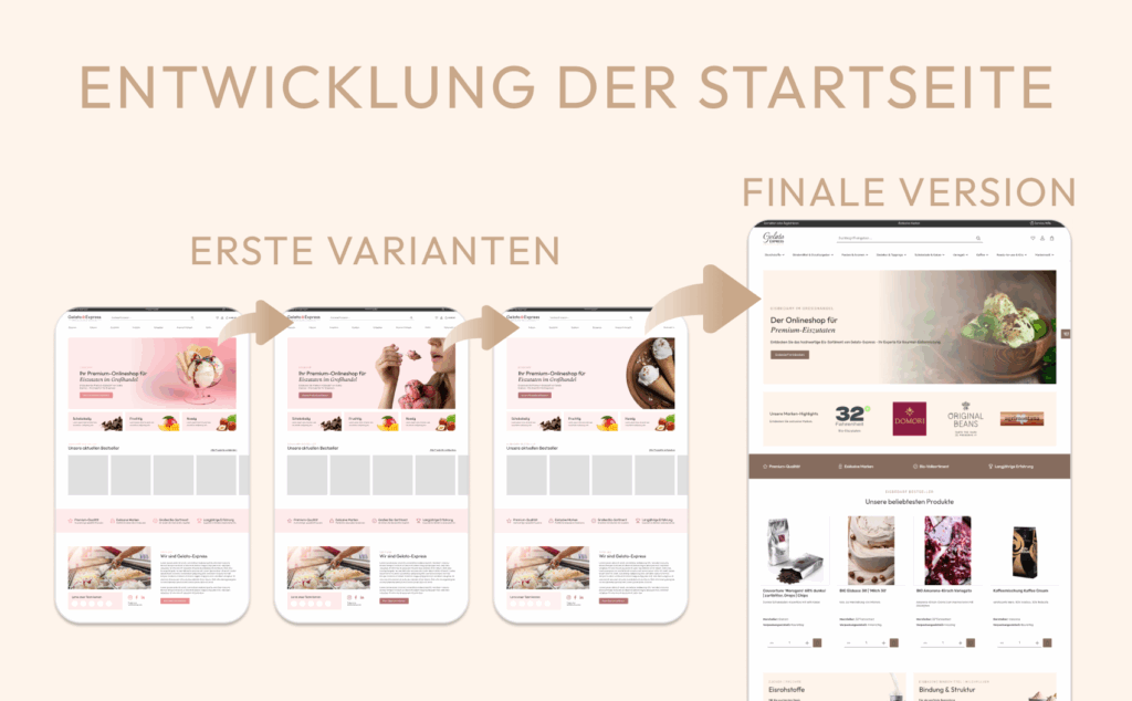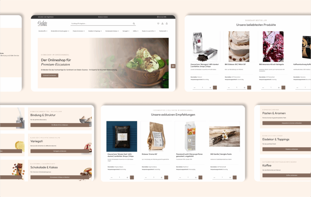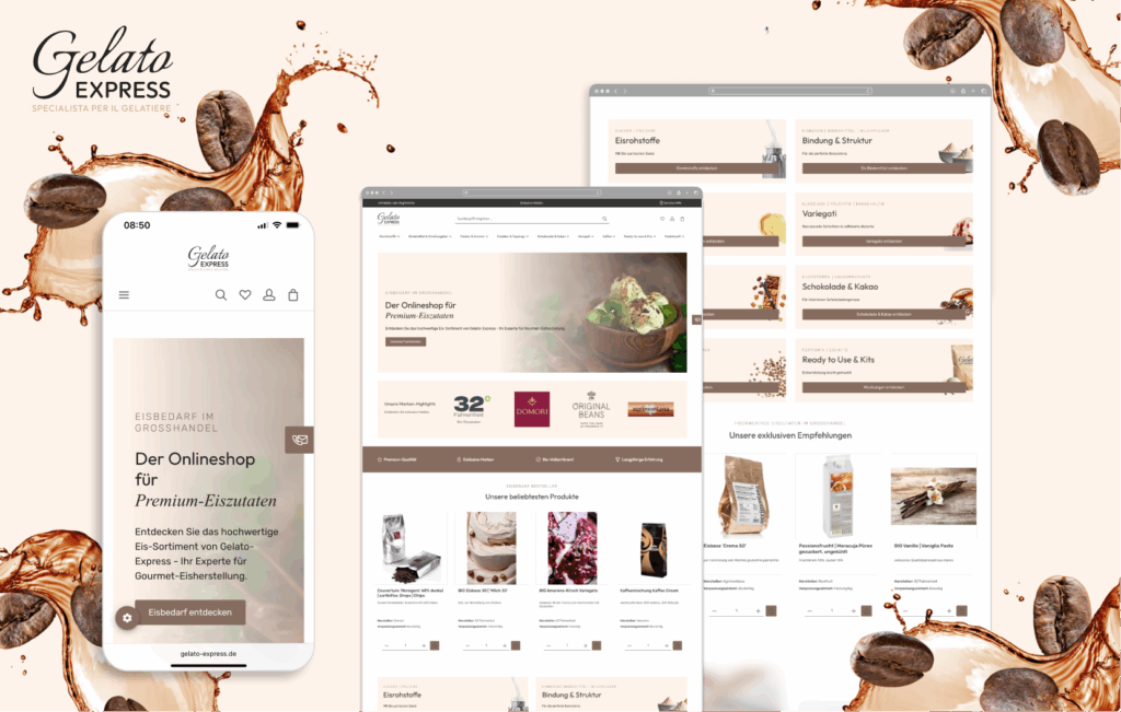 Wir haben Gelato-Express von der Markenentwicklung bis zum fertigen Shopware-6-Onlineshop begleitet und mit Google Ads sogar darüber hinaus. Dabei fingen unsere ersten To-dos mit dem Corporate Design an und setzten sich von der UI/UX-Optimierung, zielgerichtetem Content und bis hin zur Tracking-Integration fort, um ein nahtloses, performantes Einkaufserlebnis für Eismacher zu schaffen.