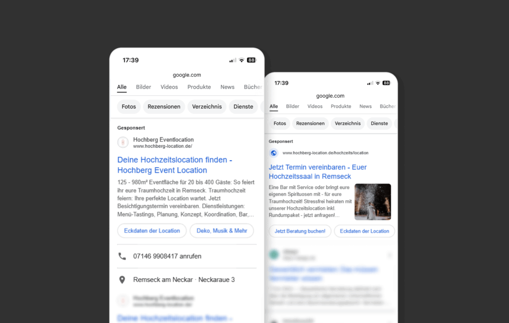 Die Suchkampagnen wurden auf Keywords wie „Hochzeitslocation Ludwigsburg“ oder „Catering Remseck“ zugeschnitten. Durch kontinuierliche Anpassung der Anzeigentexte, Verfeinerung der Keyword-Strategien und Bidding-Optimierungen konnten Reichweite, Klickzahlen und Conversion-Rates deutlich gesteigert werden.