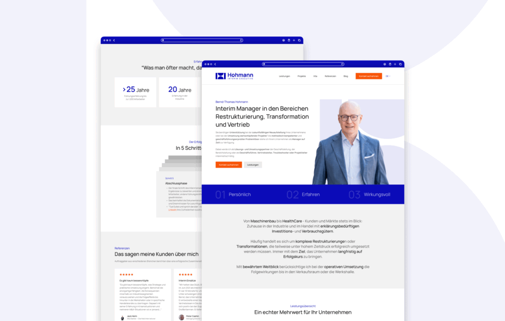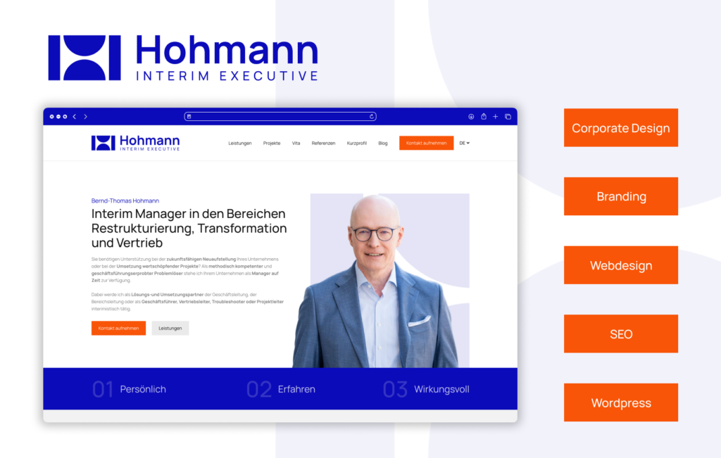 Für den Interim Manager Bernd-Thomas Hohmann haben wir bei Ostend einen vollständigen Markenauftritt entwickelt – vom Logo über das Corporate Design bis hin zur neuen Website. Ziel war ein moderner, klarer und überzeugender Auftritt, der sowohl die Dienstleistung als auch die Persönlichkeit des Kunden transportiert.