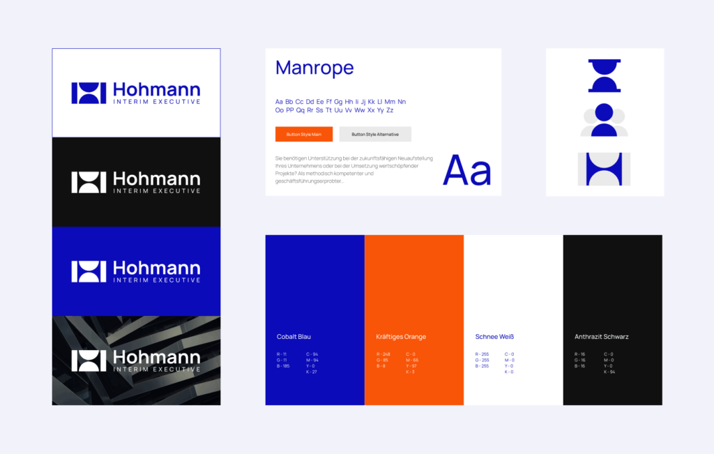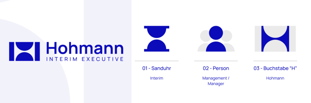 Auch das Logo wurde komplett neu konzipiert: Es vereint symbolisch die Rolle des Interim Managers mit der Person Bernd-Thomas Hohmann. Zwei abstrahierte Piktogramme – eine Sanduhr (als Symbol für temporäre Führungsaufgaben) und eine Person – verschmelzen zu einem stilisierten „H“, dem Anfangsbuchstaben seines Nachnamens. So entsteht ein visuell starkes Zeichen, das seine Tätigkeit auf den Punkt bringt.