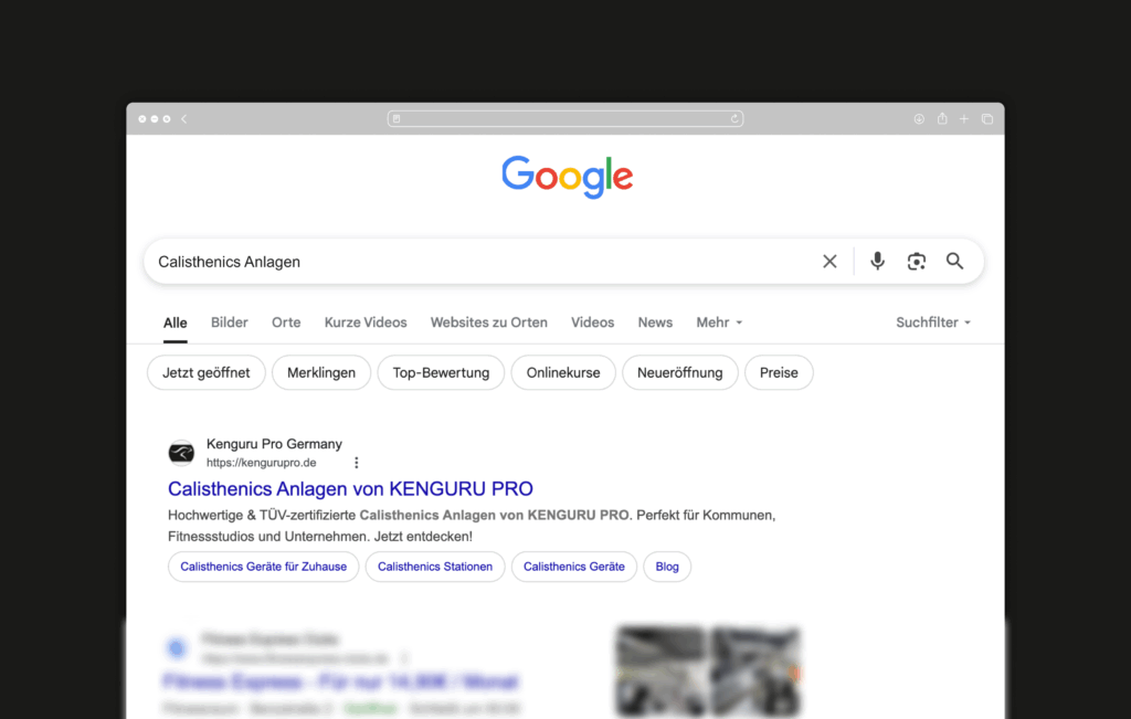 Darüber hinaus wurde der gesamte Content für die Website erstellt, gezielt auf die SEO-Anforderungen ausgerichtet und konsequent an der Suchintention der Zielgruppe ausgerichtet. So wurden Inhalte entwickelt, die nicht nur informativ und relevant sind, sondern auch die Fragen und Bedürfnisse potenzieller Nutzer klar beantworten. Bereits kurz nach dem Launch erreichte die Website Platzierungen auf der ersten Seite der Google-Suchergebnissen, unter anderem für die zentralen Keywords „Calisthenics Anlage“ und „Calisthenics Geräte“.
