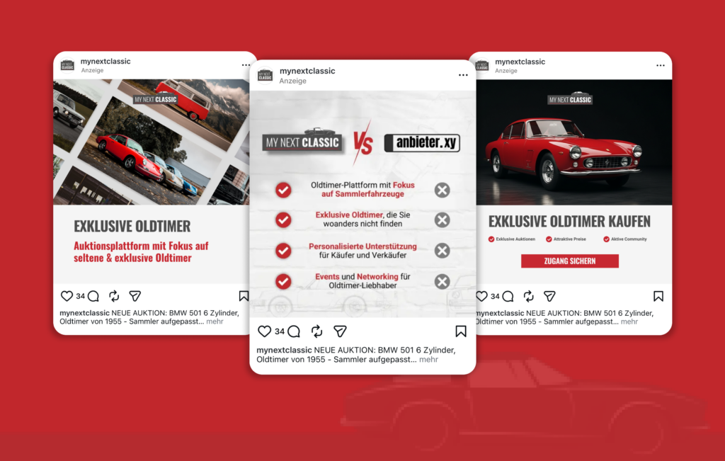 Im Mittelpunkt der Zusammenarbeit mit My Next Classic stand der Aufbau einer skalierbaren Paid-Ads-Strategie zur nachhaltigen Leadgenerierung für das Oldtimer-Auktionsportal. Der Fokus lag dabei auf der Konzeption, Umsetzung und kontinuierlichen Optimierung von datengetriebenen Social Ads und Search Ads – von der strategischen Ausrichtung über die Umsetzung bis hin zur laufenden Performance Marketing Betreuung. Dazu gehörte auch zielgruppengerechtes Copywriting als auch die Entwicklung und Produktion der Creatives. Ziel war es, die besondere Emotionalität und Exklusivität der Oldtimer-Welt authentisch zu transportieren und gleichzeitig klare Lead-Anreize zu schaffen.