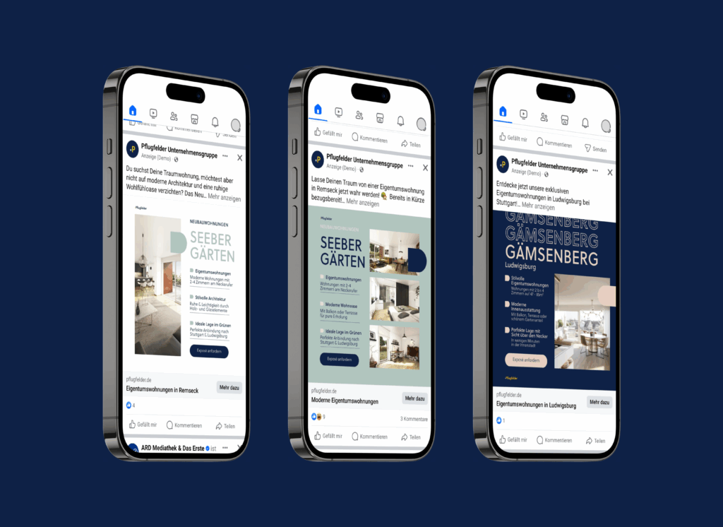 Nach einem gemeinsamen Kick-Off des Projektes hat Ostend Digital die Konzeption und die grafische Umsetzung der Werbekampagnen im Corporate Design der Pflugfelder Unternehmensgruppe übernommen. Um die Alleinstellungsmerkmale der Projekte hervorzuheben, haben wir unseren Fokus auf ein einheitliches, kommunikatives Design und überzeugende Botschaften gelegt. Es folgten die Einrichtung der Kampagne im Werbeanzeigenmanager von Meta, sowie Variationen des Copywriting mit weiteren Unique Selling Propositions für die Werbeanzeigen in den sozialen Netzwerken.