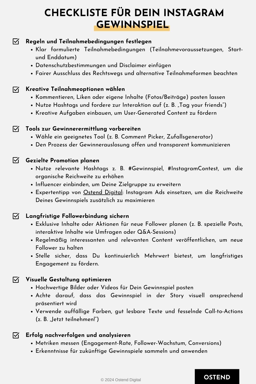 Um sicherzustellen, dass Du Dein Instagram Gewinnspiel erfolgreich umsetzt, haben wir alle relevanten Schritte und Details in einer übersichtlichen Checkliste für Dich zusammengefasst. So hast Du alle wichtigen Punkte auf einen Blick:
