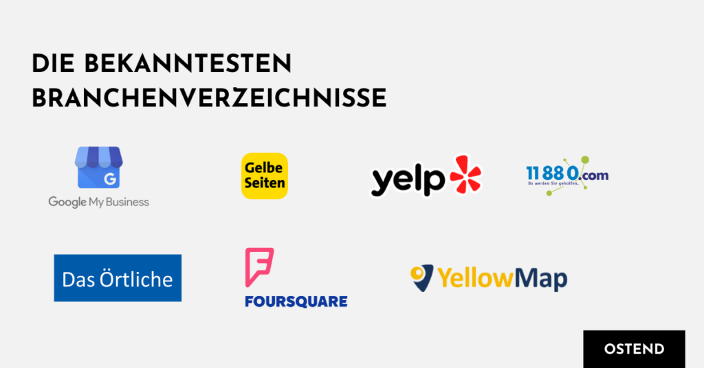 Zu den bekanntesten lokalen Online-Verzeichnissen zählen Google My Business, Yelp, Bing Places, Gelbe Seiten und Foursquare. Aber es gibt noch viele weitere, die in Deiner Region relevant sein könnten.