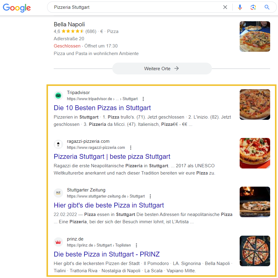 Lokale Suchanfragen könnten zum Beispiel auch so aussehen: “Café in Stuttgart” oder “Pizzeria in München” . Google gibt hierbei in den Suchergebnissen bereits oben auf der Suchergebnisseite oft eine Karte mit den entsprechenden Unternehmen in der Nähe an. Diese Unternehmen werden als “Google My Business” Einträge bezeichnet. Gleich darunter findest Du in der Regel Search Snippets weiterer Websites, die für die lokalen Ergebnisse gerankt werden.