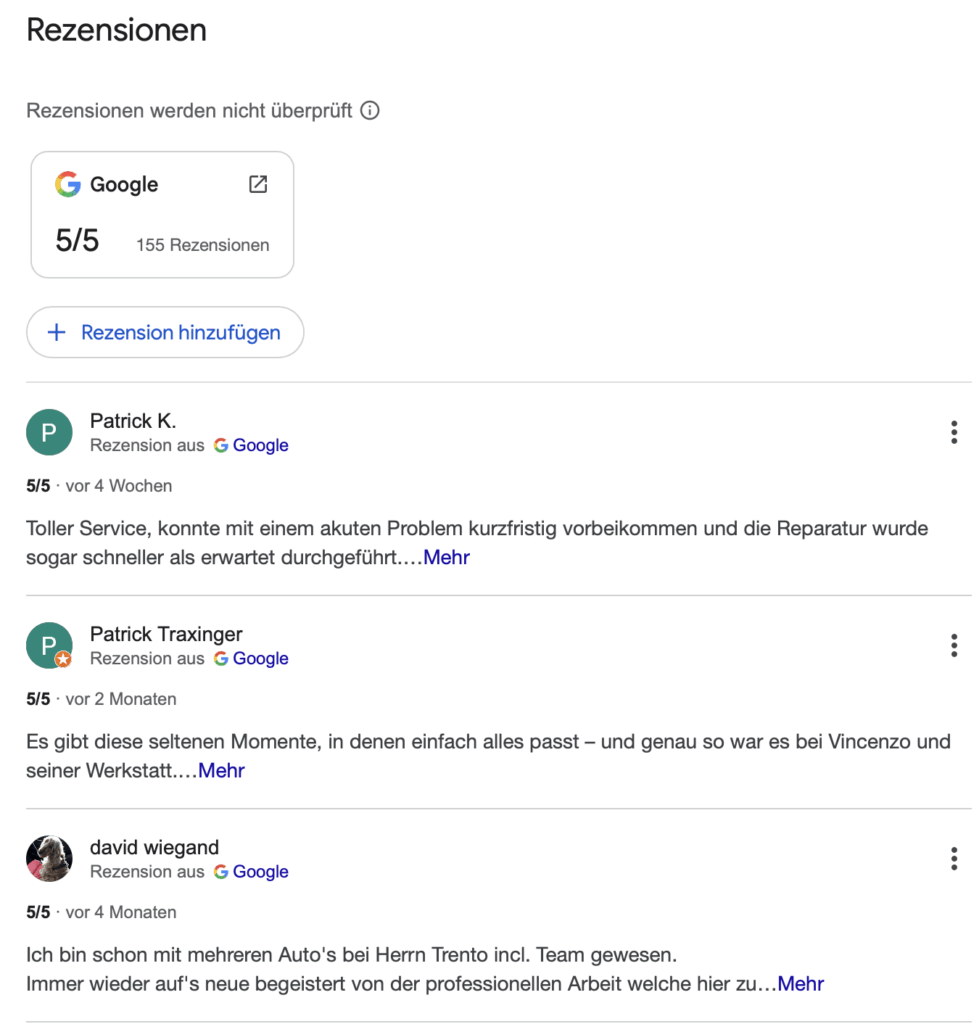 Ein gutes Beispiel ist Trento Automobile: Durch kontinuierlich eingehende Bewertungen, die den Service und die Zuverlässigkeit der Werkstatt loben, konnte nicht nur das Vertrauen neuer Kund*innen gestärkt, sondern auch die Sichtbarkeit in der lokalen Suche erhöht werden.