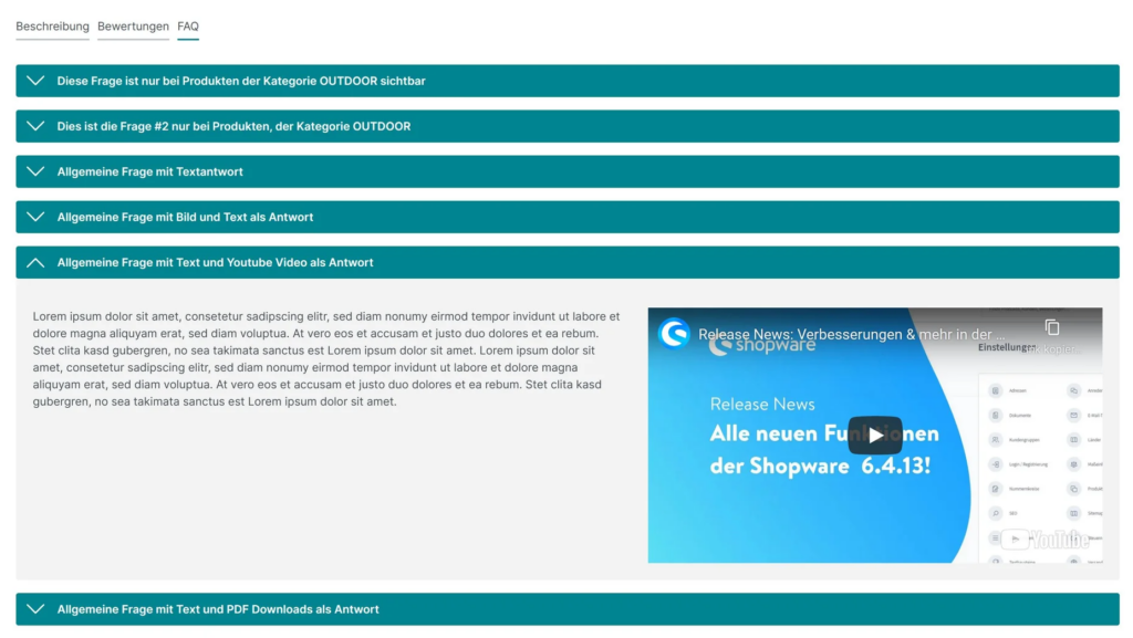 Dieses Plugin ist ideal für die Anzeige als Rich Snippets in Suchergebnissen. Es ermöglicht die Erstellung von FAQs für die Produktseite, die entweder als Tab, unterhalb oder neben der Produktbeschreibung (wie in folgender Abbildung) angezeigt werden.