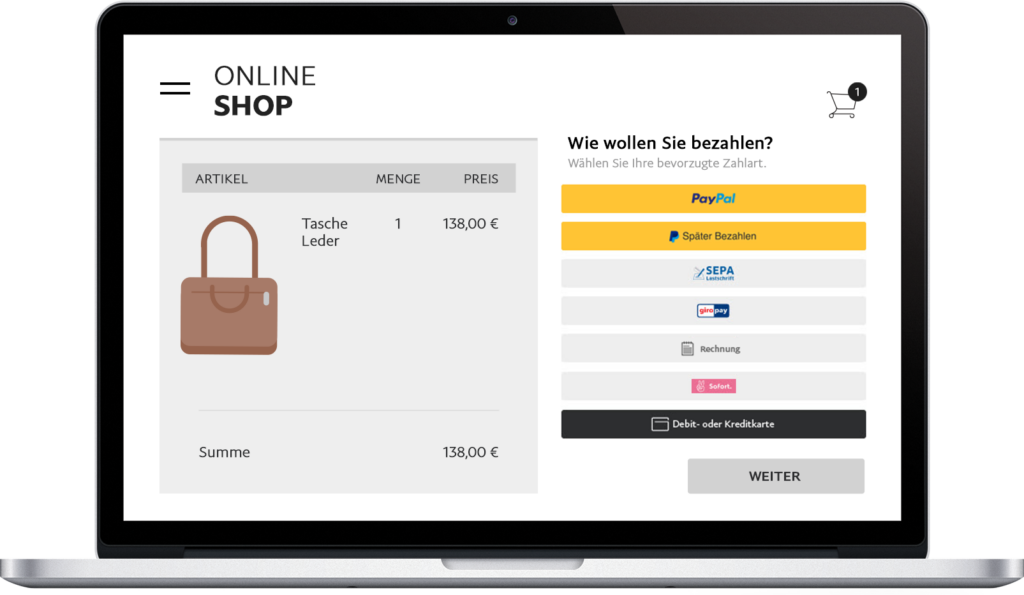 PayPal ist vorinstalliert und ermöglicht es Dir, bis zu 9 Zahlungsmethoden anzubieten. Die Verbindung mit PayPal ist einfach und schnell.